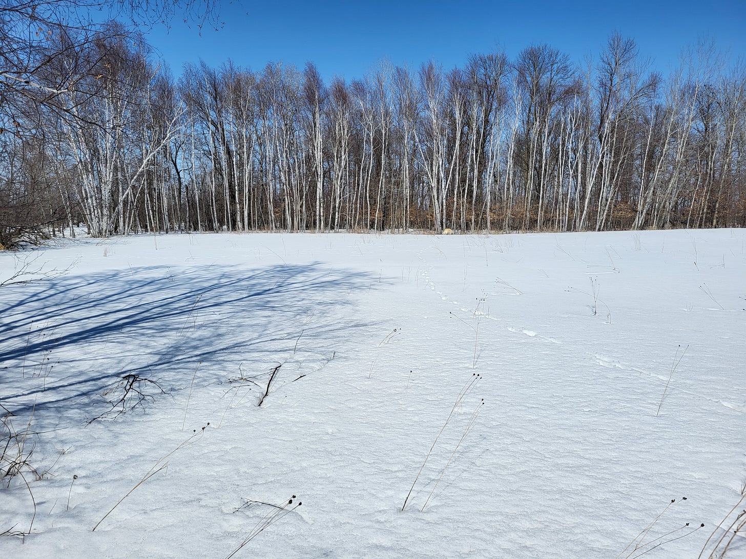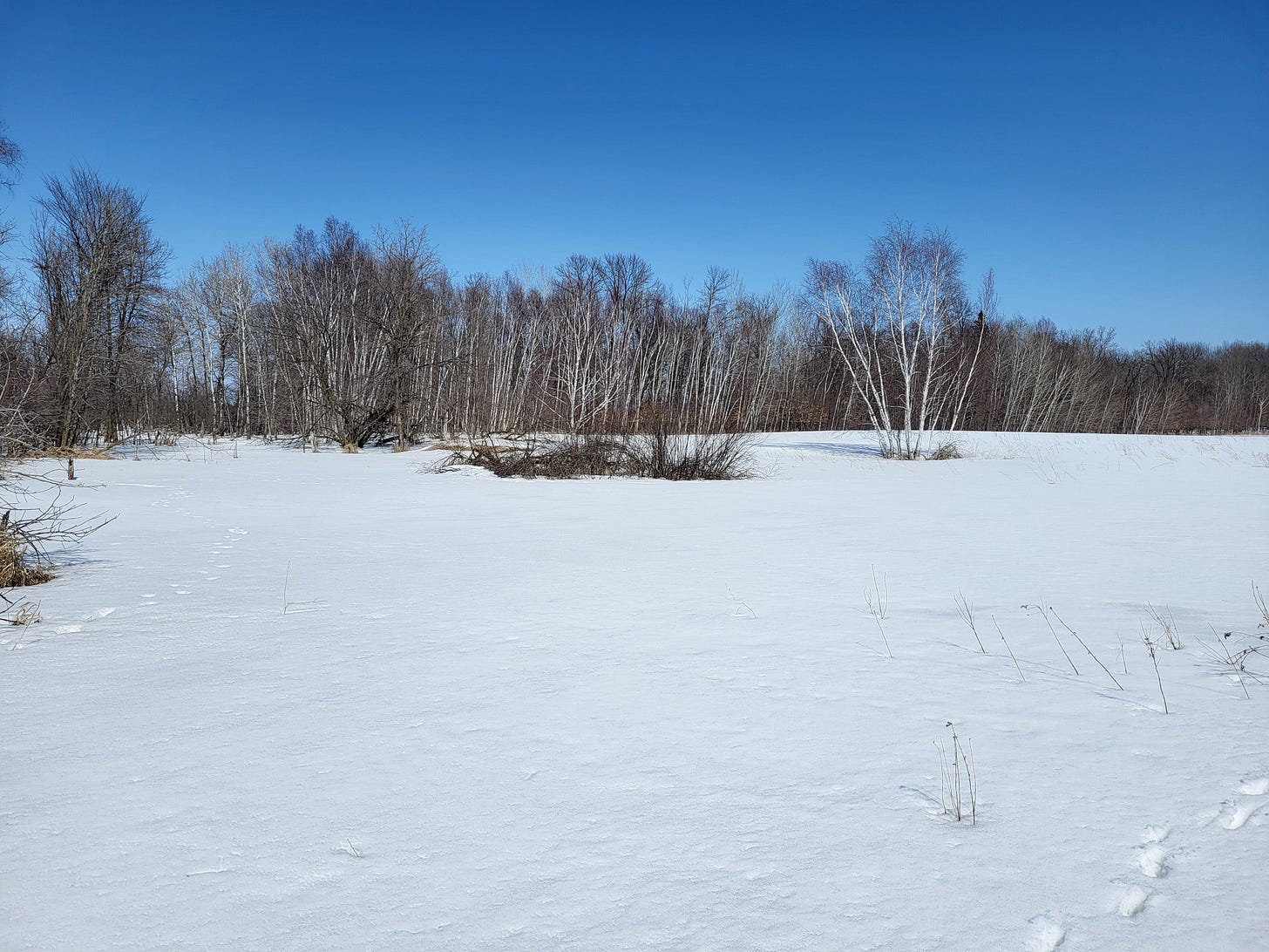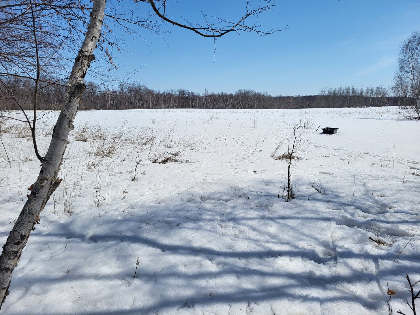 We finally had a 40F+ day, April 08! I can’t drive into the property at the access, so I’m snowshoeing in from the road. There is a wetland on the other side of those trees in the upper left; on the other side of the wetland is where the orchard will be. *