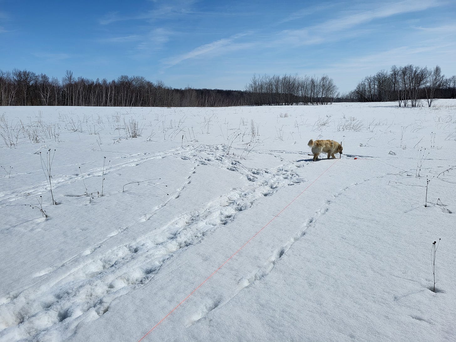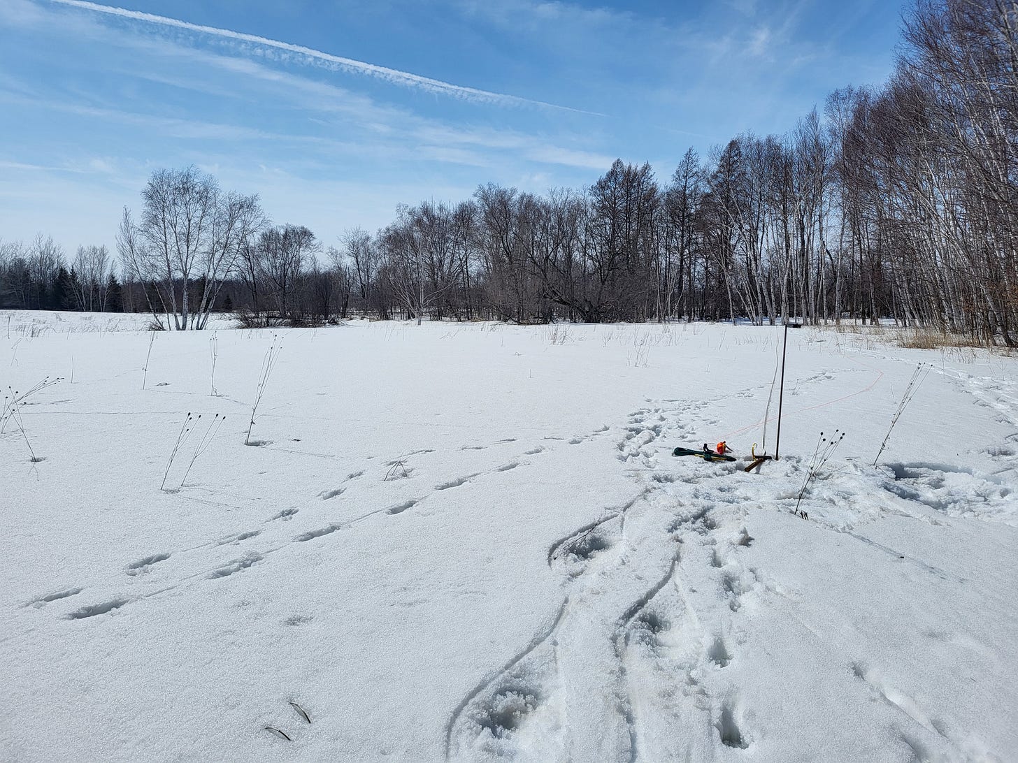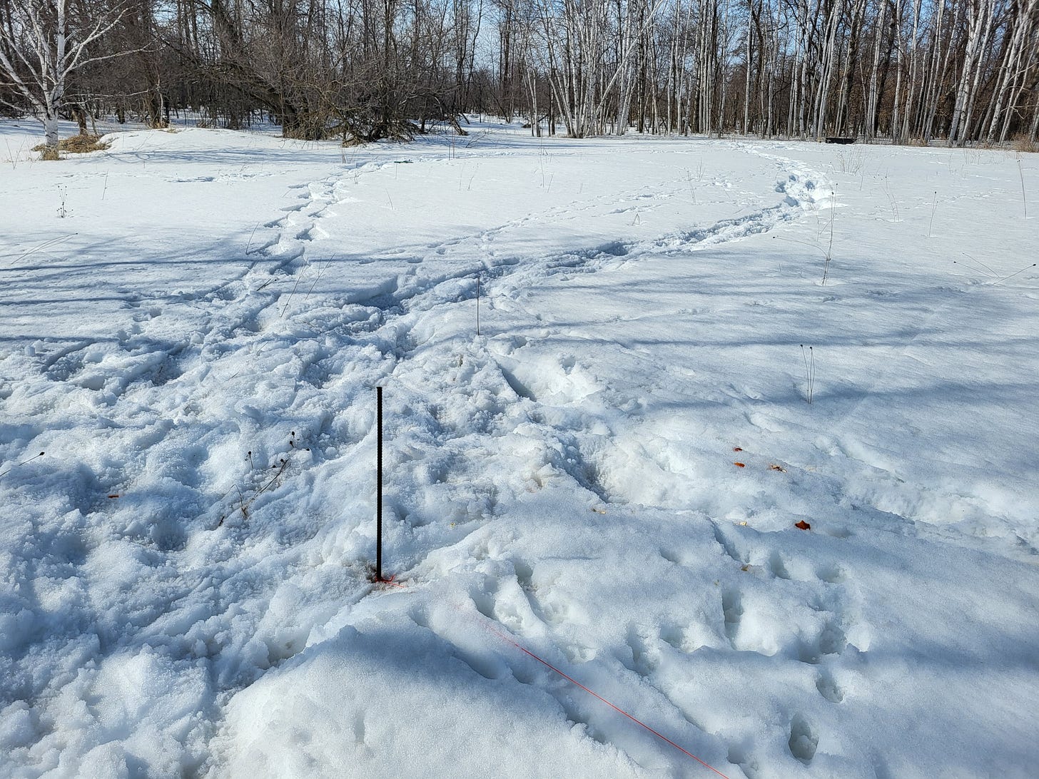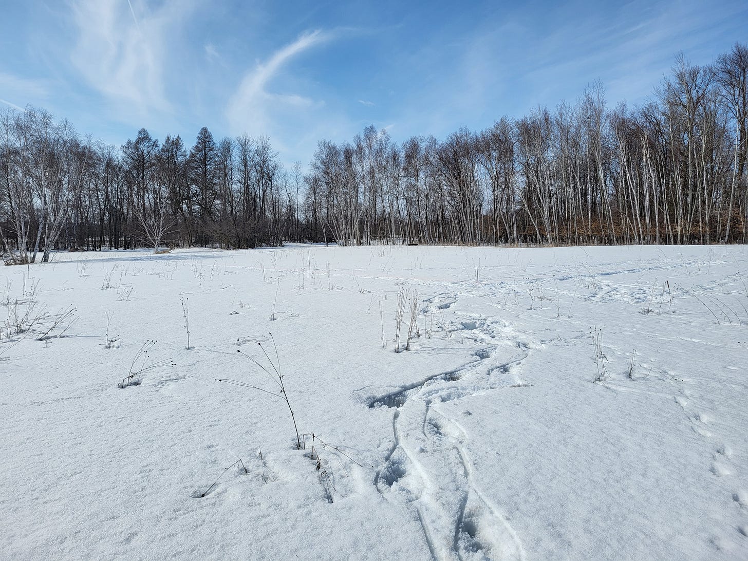 We finally had a 40F+ day, April 08! I can’t drive into the property at the access, so I’m snowshoeing in from the road. There is a wetland on the other side of those trees in the upper left; on the other side of the wetland is where the orchard will be. *