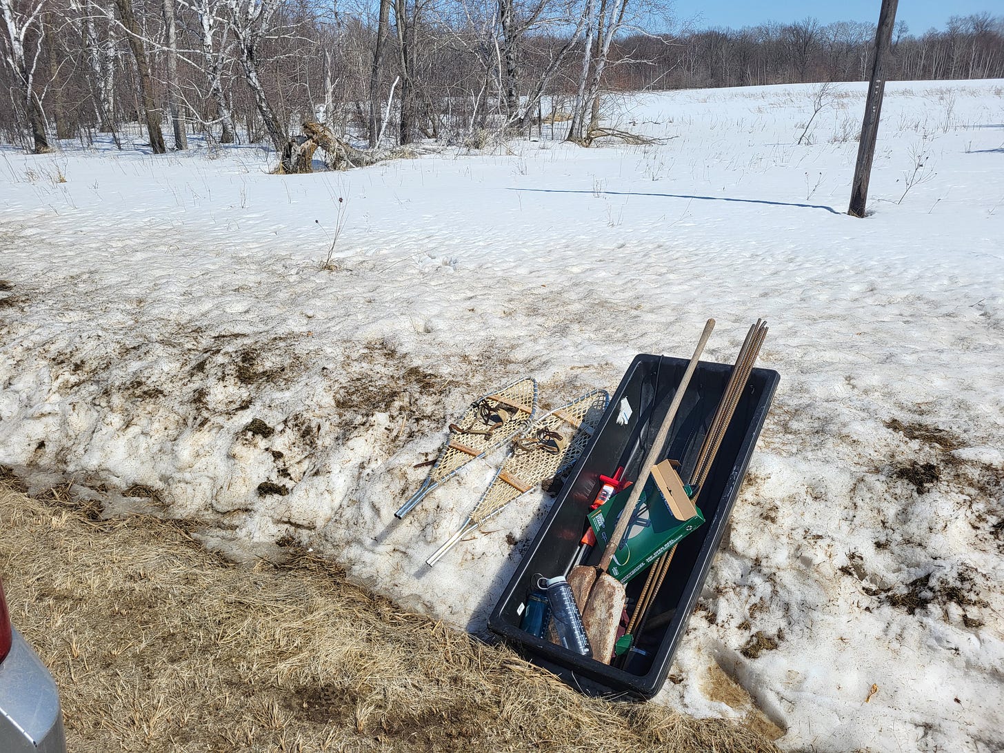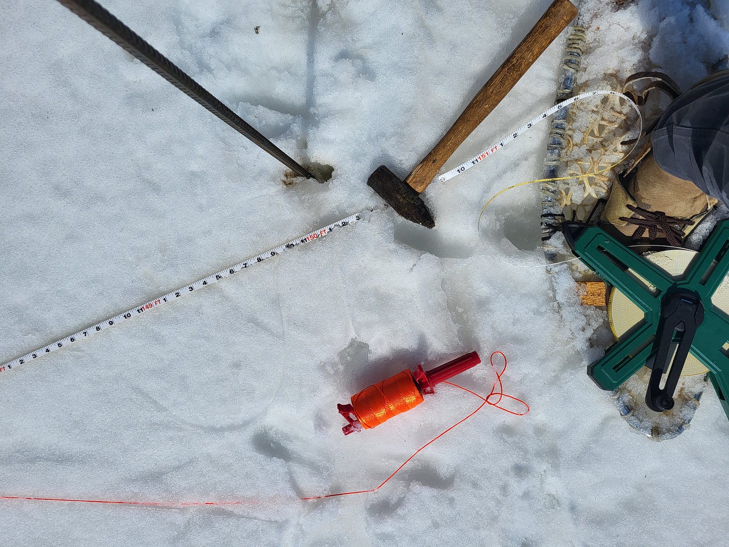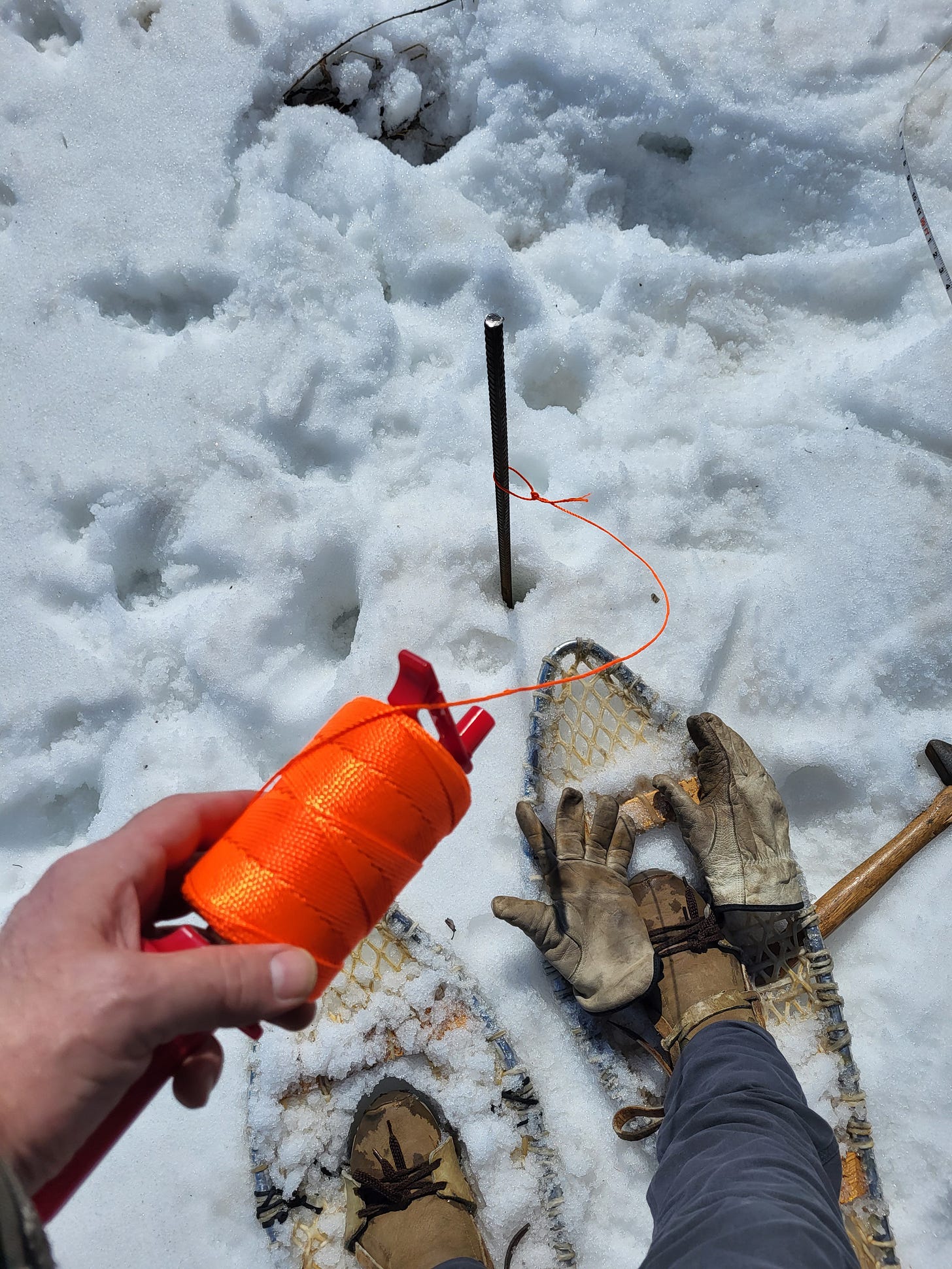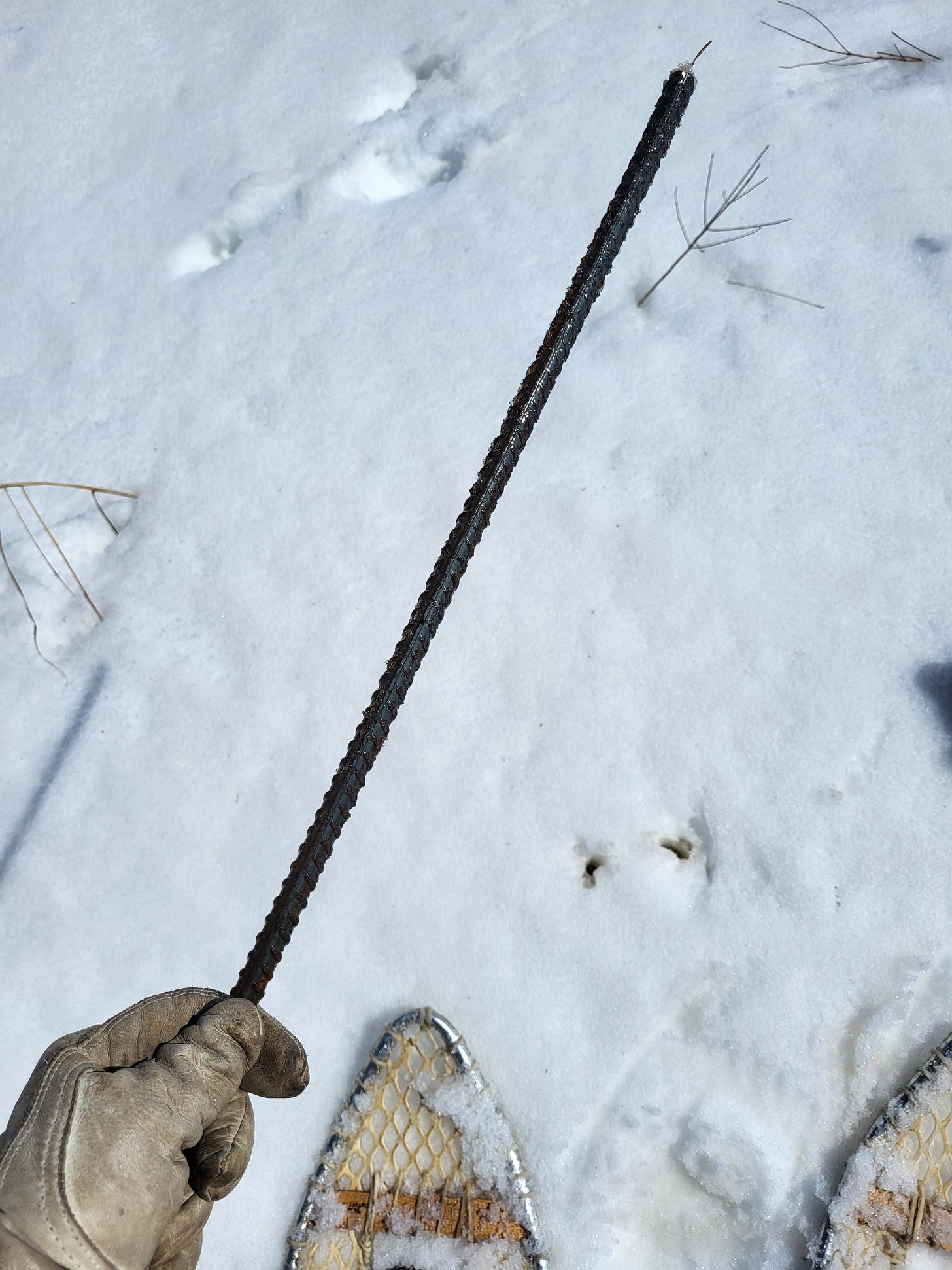 Simple tools: some 5ft rebar for posts, a hand maul, a 300ft measuring tape, about 750 ft of mason’s line, a shovel I probably don’t need, water bottles, a sled and snowshoes.
