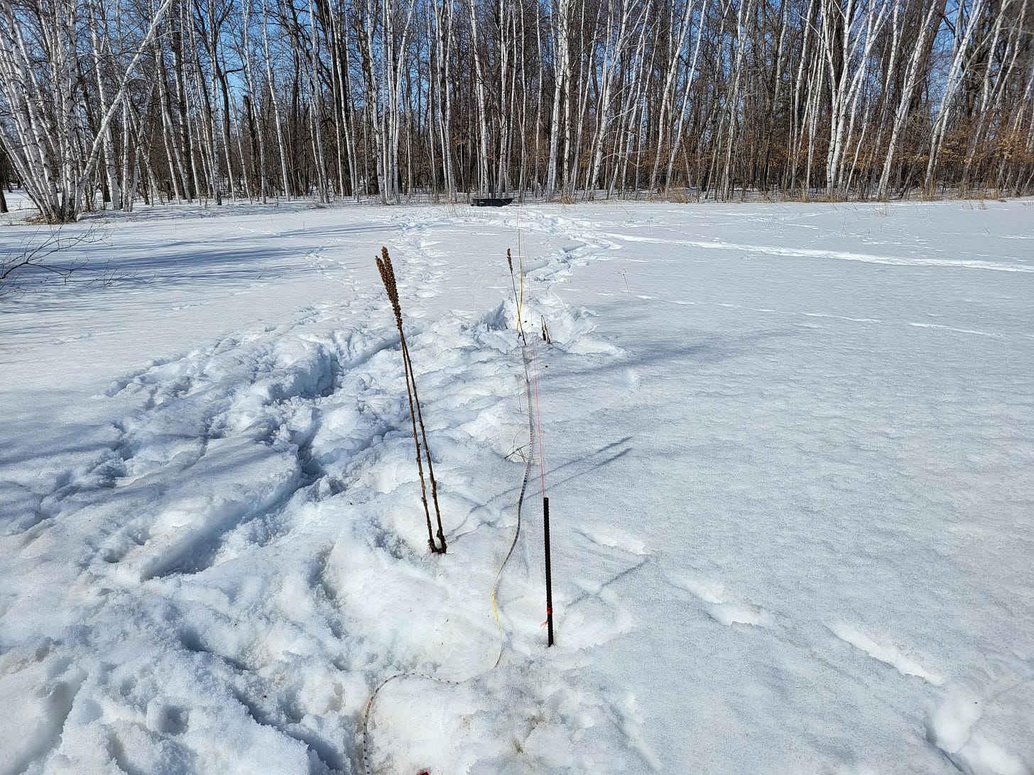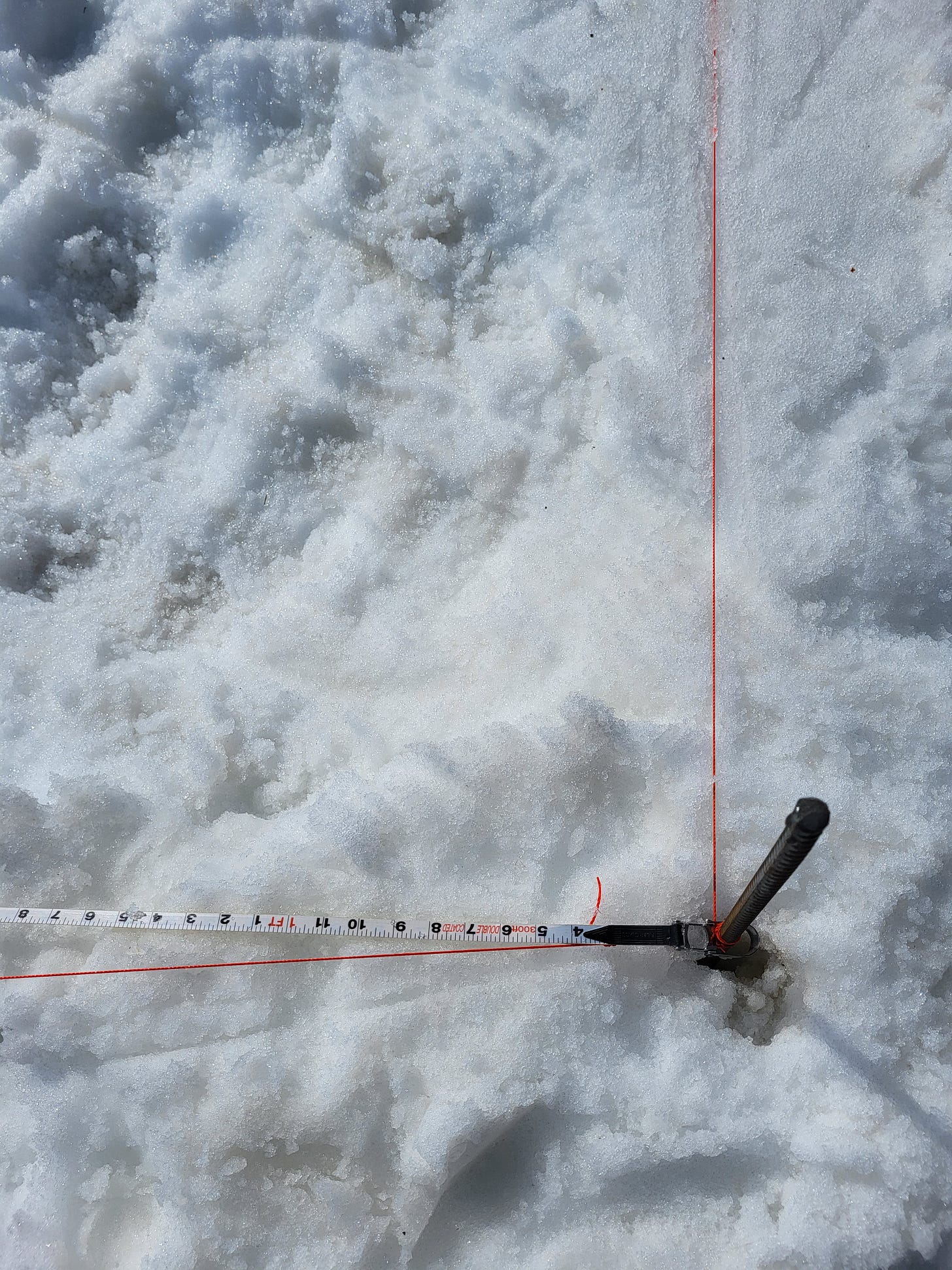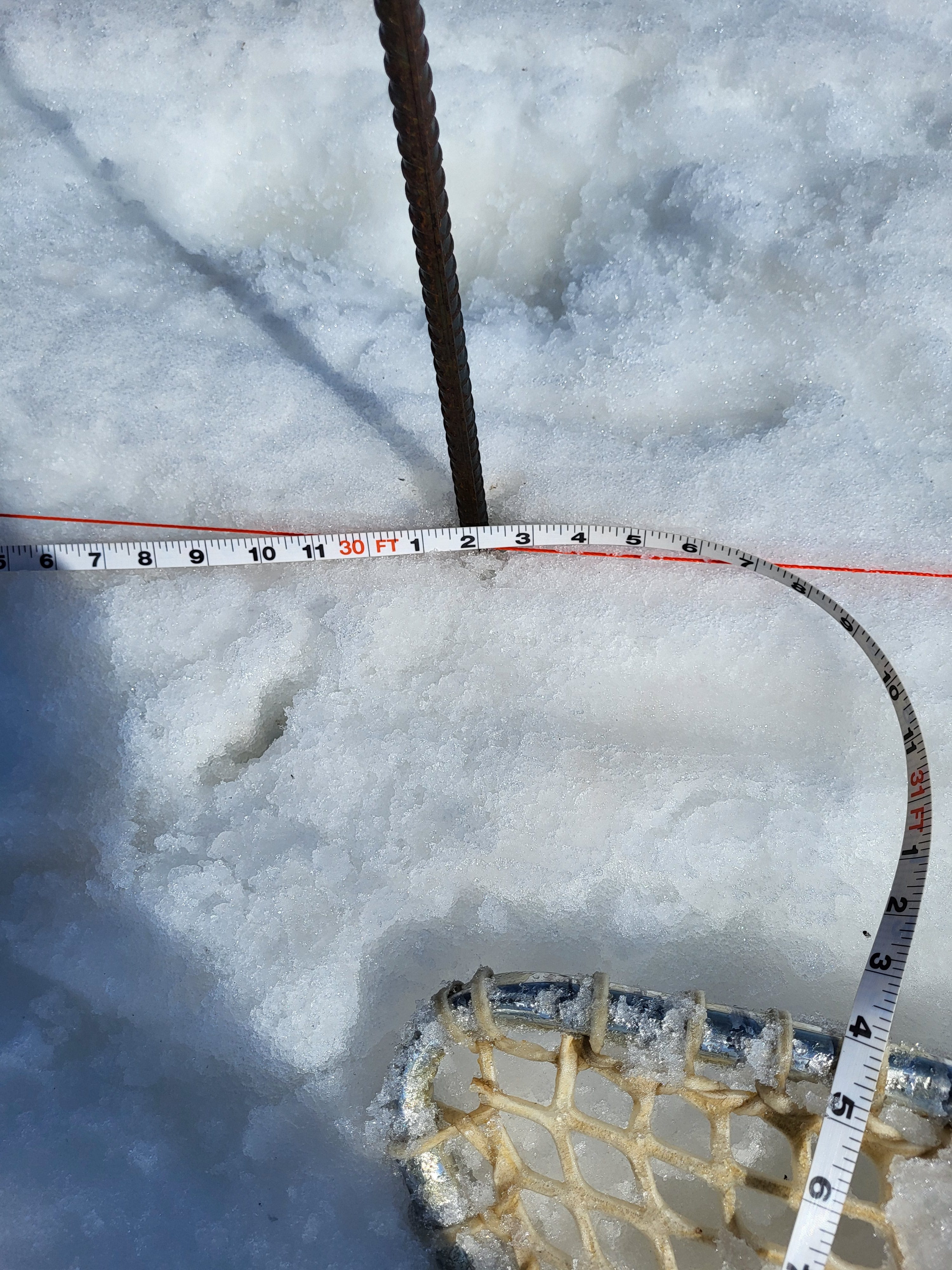 About 20inches of snow here in the corner. There is 30+ elsewhere. Trudging around in this wet heavy snow with snowshoes is a workout. Occasionally the snow resting on heavy grass collapses, the snowshoe cuts in and I face-plant. It is not easy standing back up without ski poles. I might have waited for the snow to melt, but I needed to get outside and do something.