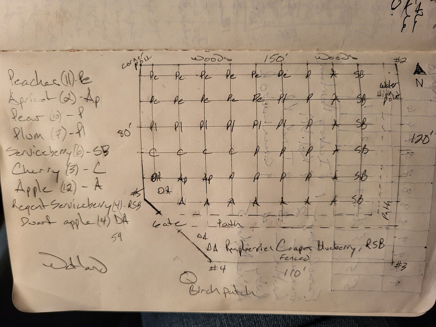 The outline is where a fence would be, but I am wrapping each tree with a grow-tube, 6ft tall, protecting the trees from deer the first two years at least, while growing a nice straight trunk. I will have to fence the shrubs, vines and canes more immediately.