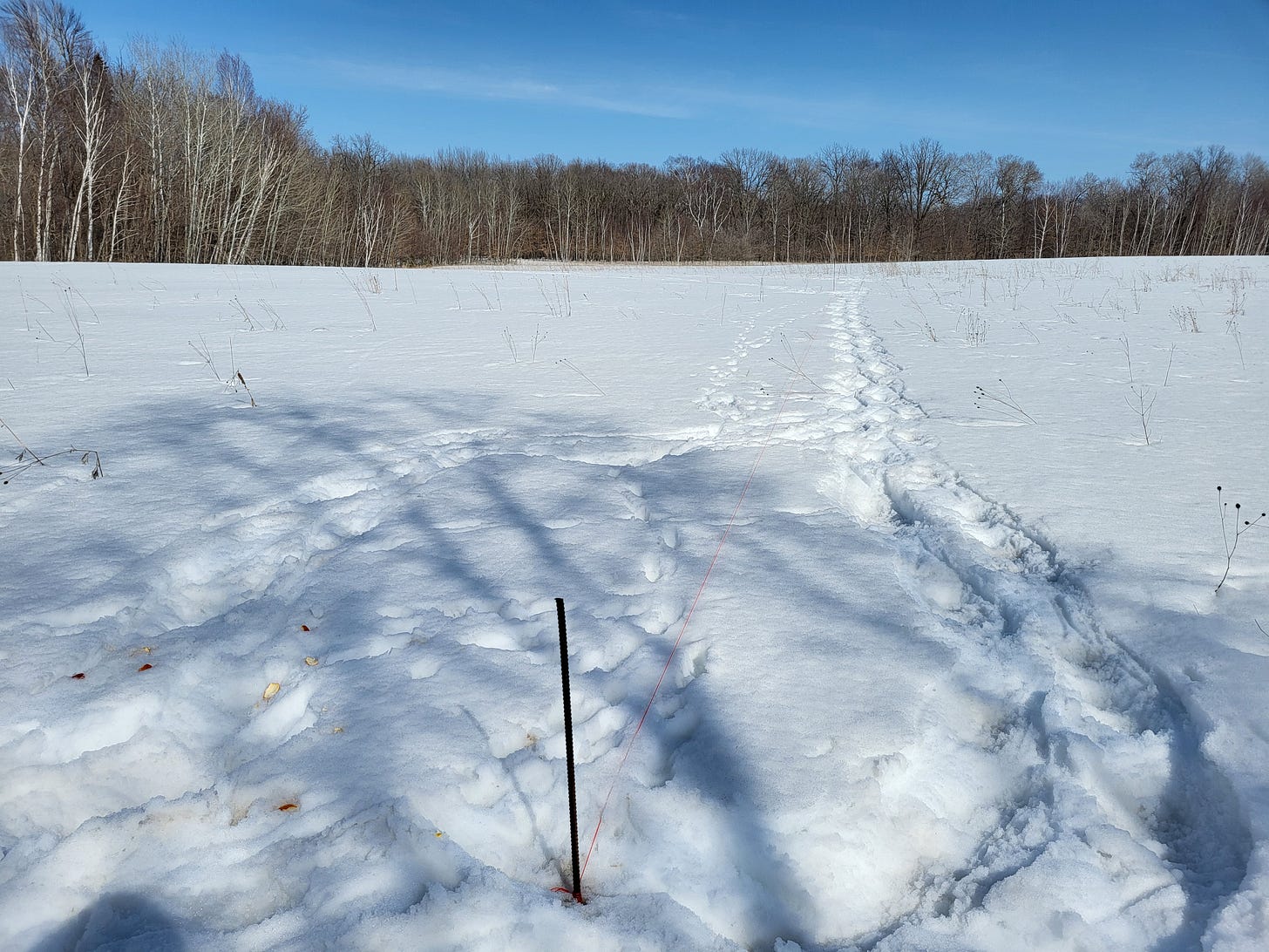 Facing east. Post number four heading back west toward the wetland, 110ft, using the 3-4-5 method again from post three, also measuring 120ft from the woods edge line.