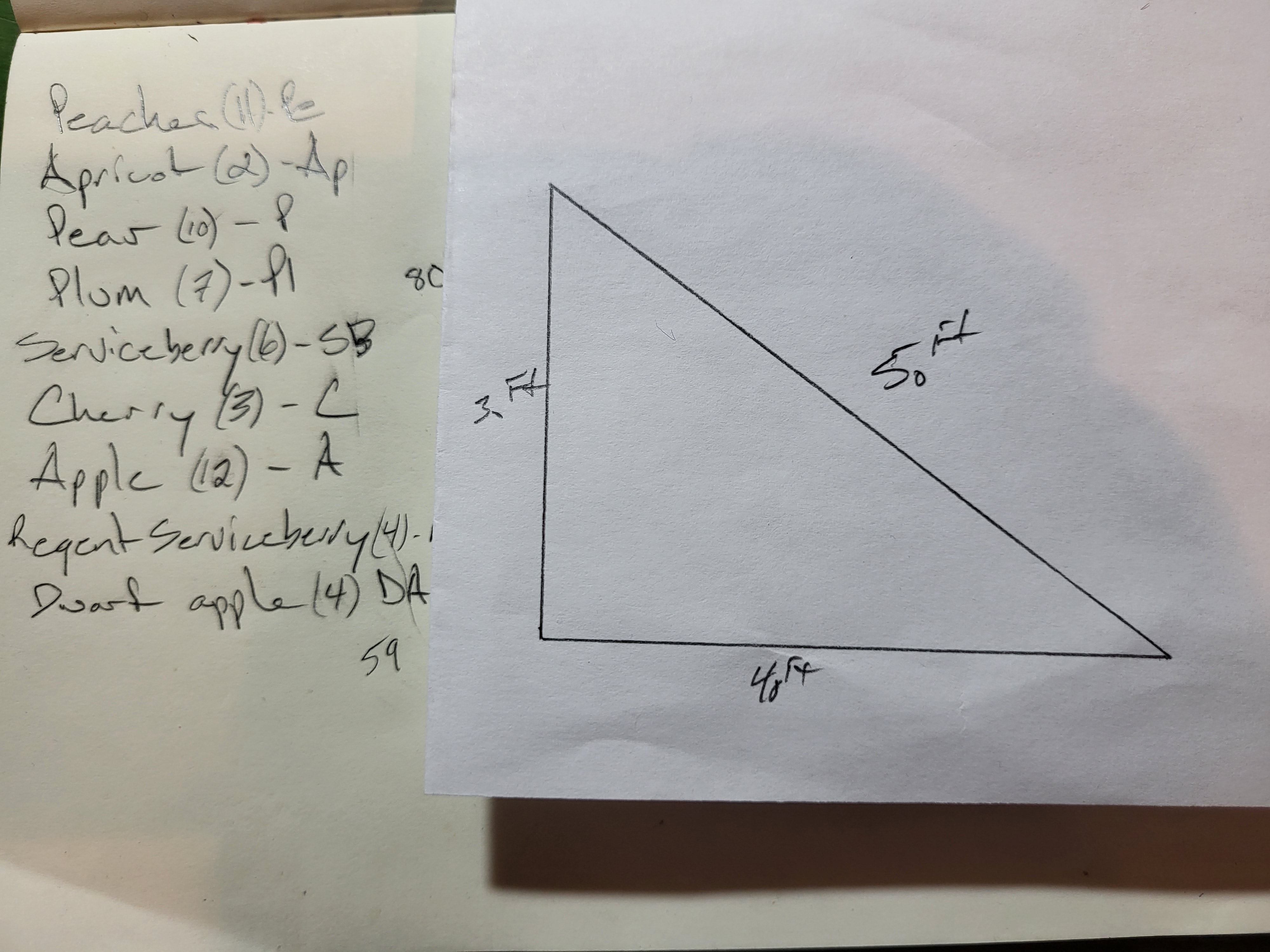 This is a simple way to set a 90deg corner, I learned in construction. I set a post on the north south line 30ft from the second post, another on the east west line 40ft out. Fifty feet is the distance between the posts. This method works for 30-40-50ft, 3-4-5ft, or 3-4-5in, or I suppose for international readers, 3-4-5meters. In this case it is exact enough.
