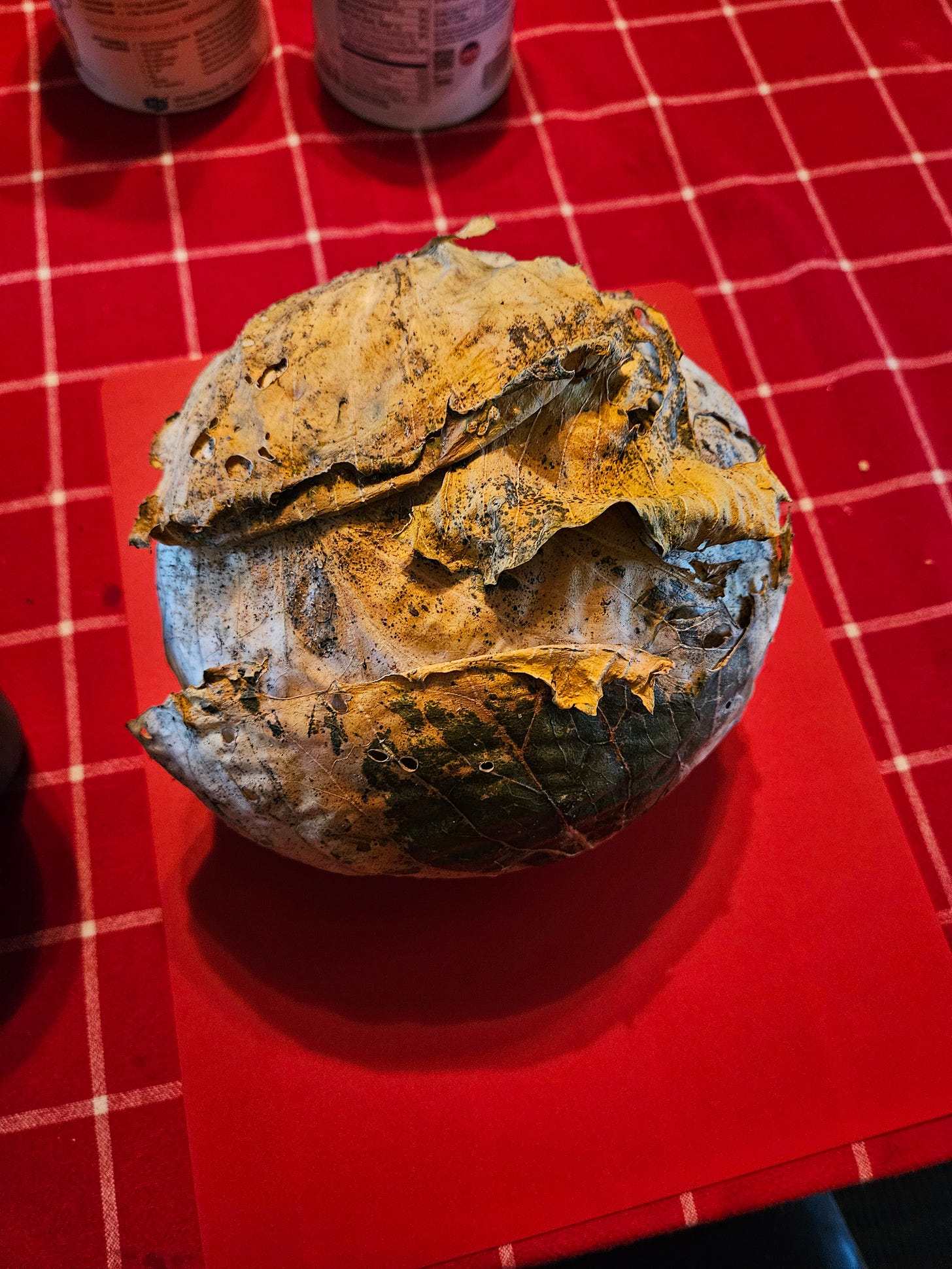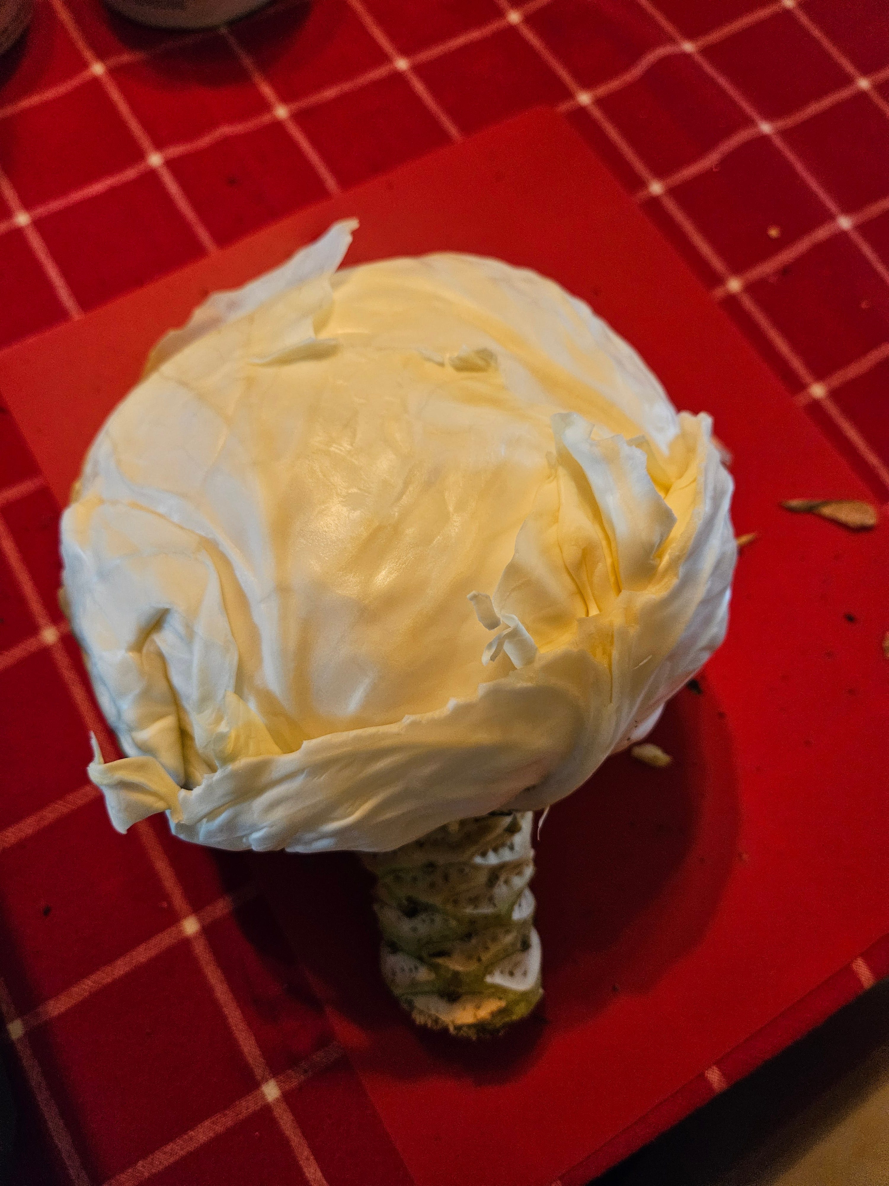 This is a cabbage in storage for three months or so. Peel a few layers and the cabbage is in excellent shape, though the light makes it look yellow, it is white with a hint of green. Much better tasting than store-bought this time of year.