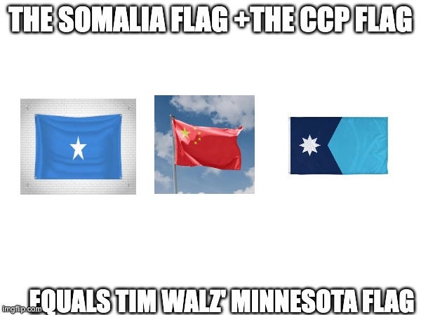 He gave free health care, housing, food and money to illegal immigrants. He changed the state flag to be an amalgam of the Somali and Chinese flags.4 He dictated a no fossil fuel electrical grid by 2040, while he negotiated 10 data centers that will use as much electricity as the entire state uses now. And all the while, both terms, he was not just ignoring tens of billions of dollars of welfare fraud, he was actively facilitating it, especially for Somalis, as they are also much of the muscle for thieving elections. Of course, a lot of that money flowed back to Walz and democrats. You can be sure Walz has a fat stash somewhere, like the rest of his Administration and major MN democrat politicians. Or not; it’s not money that drives them so much, but the acquisition of unaccountable power - and obviously the intention to destroy America by bankrupting it.